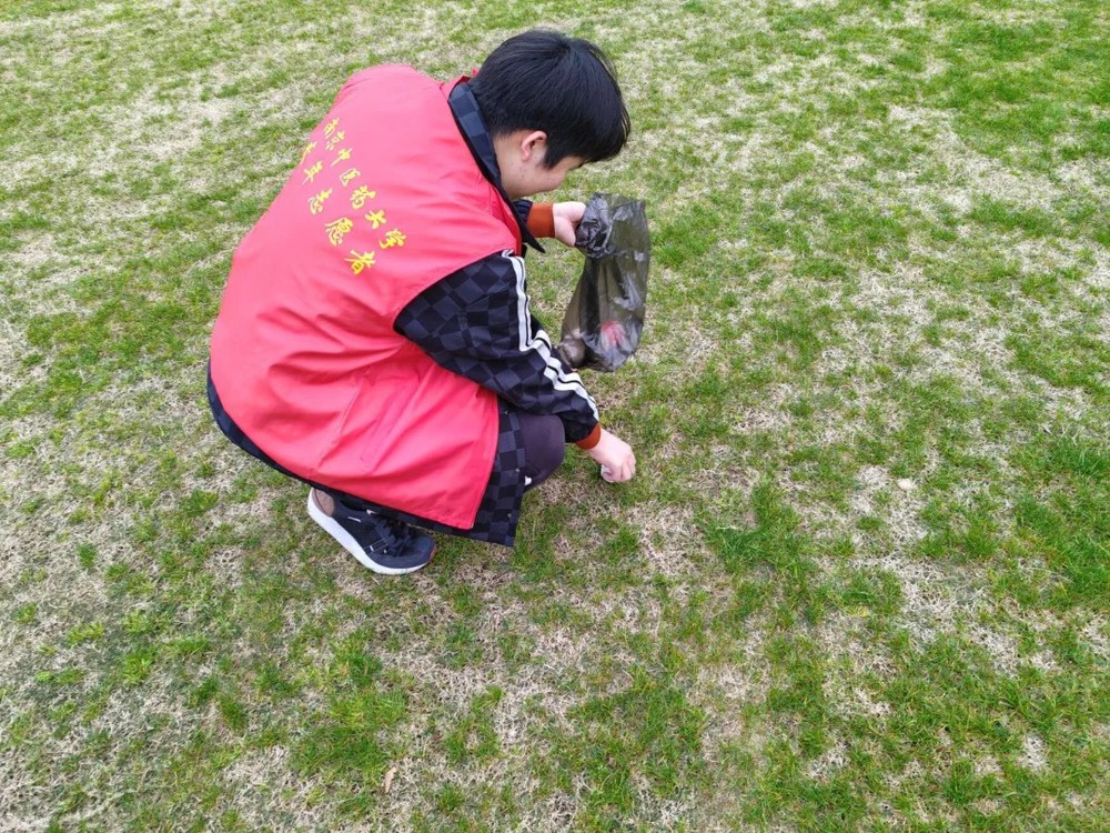待人员悉数到齐后,团支书给大家发放了红马甲以及垃圾袋,随后同学们便三五成群开始了活动。有的小组前往草坪,捡拾乱扔的烟头以及野餐遗留下的塑料瓶,有的小组沿着绕湖大道前行,拾起纸团和塑料袋。