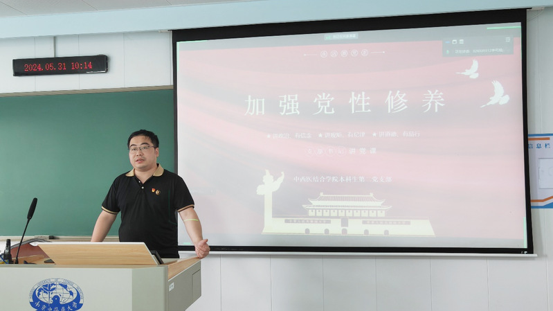 党支部书记徐梓凌老师从“五个方面、四个坚守、注重实践、永葆先进”四个部分讲述。新时代共产党人强党性要从五个方面下功夫:“加强理论修养、坚定理想信念、牢记初心使命、不断修炼自我和主动担当作为。”修炼党性要做到四个坚守:“如松正心、如水恒心、如兰静心、如莲清心”,并落实于长期实践之中。修炼好共产党人的党性这门“心学”,关键在于学思用贯通、知信行统一。共产党员需不忘初心、牢记使命,知敬畏、存戒惧、守底线,不断总结学习、自我提升,以达到“我将无我,不负人民”的理想人格。