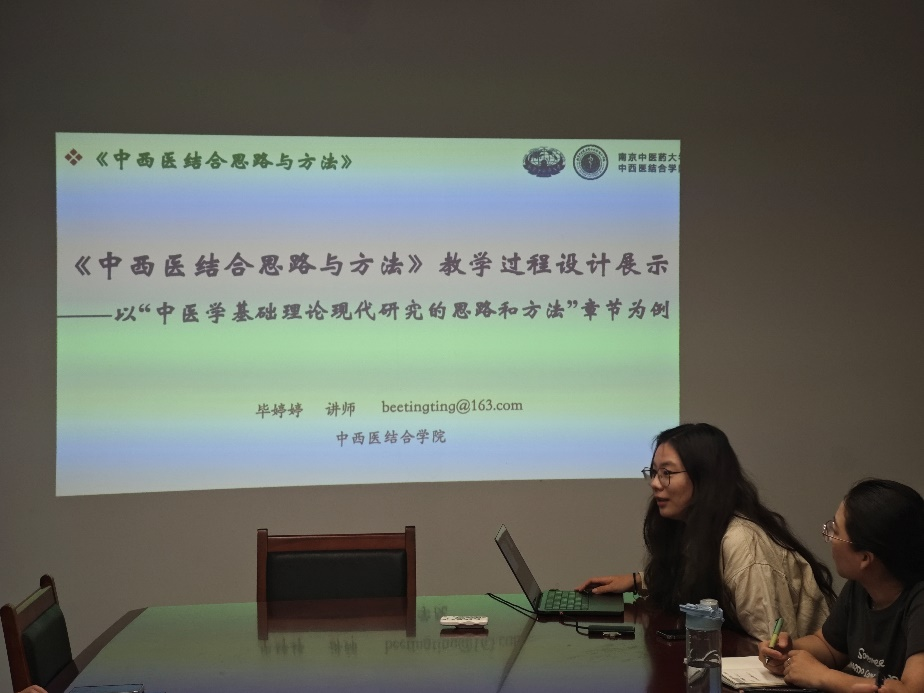 首先,毕婷婷老师以“中医学基础理论现代研究的思路和方法”章节为例,对《中西医结合思路与方法》课程设计展开介绍,她重点分享了在授课过程中引入的三个技巧:思维导图的使用、实际案例的结合以及注重临床与实验相结合的方法。与会老师针对上述内容展开交流和讨论,成小兰老师和薛梅老师分别从课时量、教学内容等方面加以点评指导。