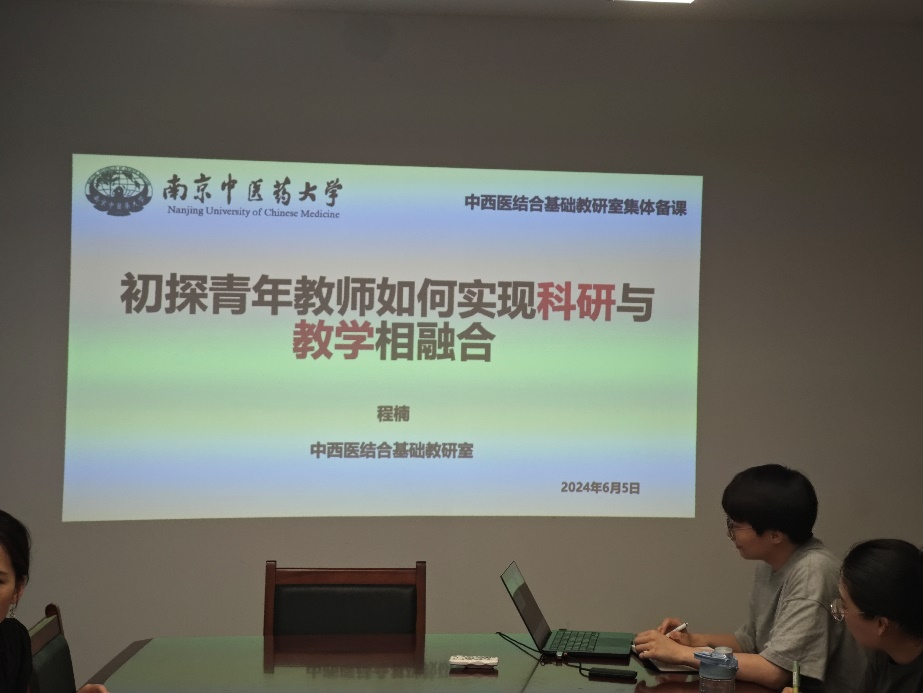 2024年6月5日,中西医结合基础教研室和循证与转化医学教研室全体教师,在丰盛楼102会议室举行集体备课活动。本次集体备课以“教研相融——青年教师对课程教学设计的思考与实践”为主题,围绕《中西医结合思路与方法》《进化与疾病》两门课程进行交流。会议由中西医结合基础医学系副主任成小兰老师主持。