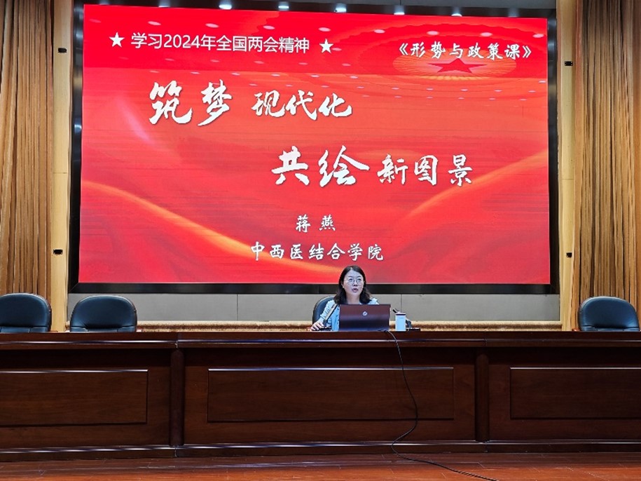 5月23日下午,M88mansion体育党总支书记蒋燕以“筑梦现代化,共绘新图景——学习2024年全国两会精神”为主题,为2023级全体员工讲授课程。
