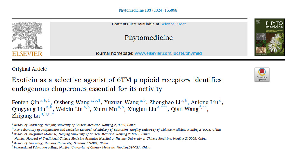 近期,M88mansion体育吕志刚教授团队在国际著名杂志Phytomedicine中科院医学一区Top期刊)上发表有关天然产物中特异性靶向μ阿片受体6次跨膜剪切异构体(6TM-MOR)的成果:“Exoticin as a selective agonist of 6TM μ opioid receptors identifies endogenous chaperones essential for its activity”