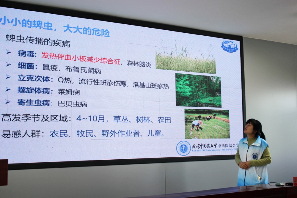志愿服务团队指导老师黄花英结合实际案例,为村民们作蜱虫防治科普讲座。她从蜱传疾病的患病生存期短、致死率高及巨大的医疗负担为切入点,详细讲解了蜱虫的生活习性、传播疾病的方式以及被叮咬后的正确处理方法,并重点提醒村民在蜱虫活跃季节时,前往田野户外,长时间在草丛、灌木丛劳作逗留时务必要加强个人防护。