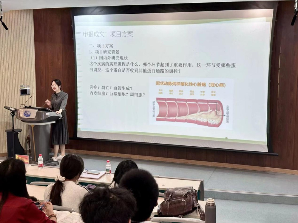 裴可老师就老员工创新创业项目申报技巧进行了讲解。她从“破题—立论—成文”三个方面点拨同学们。在破题和立论方面,裴老师建议同学们向导师等人力资源求助,并通过问卷等方式结合生活需求去开展,并通过列举清肺排毒汤研究的例子及自己过去带团队的经验,强调在实际中创新的重要性,帮助同学们平衡创新性与可行性,实现有效开题。同时,裴老师强调了写文章逻辑的重要性,并通过介绍分析冠心病研究的全过程,深刻剖析了项目的逻辑链切入方法,以及相关写作方法,并结合过去审稿的经历,提醒同学们寻求指导老师和团队帮助,以及参考文献的重要性。